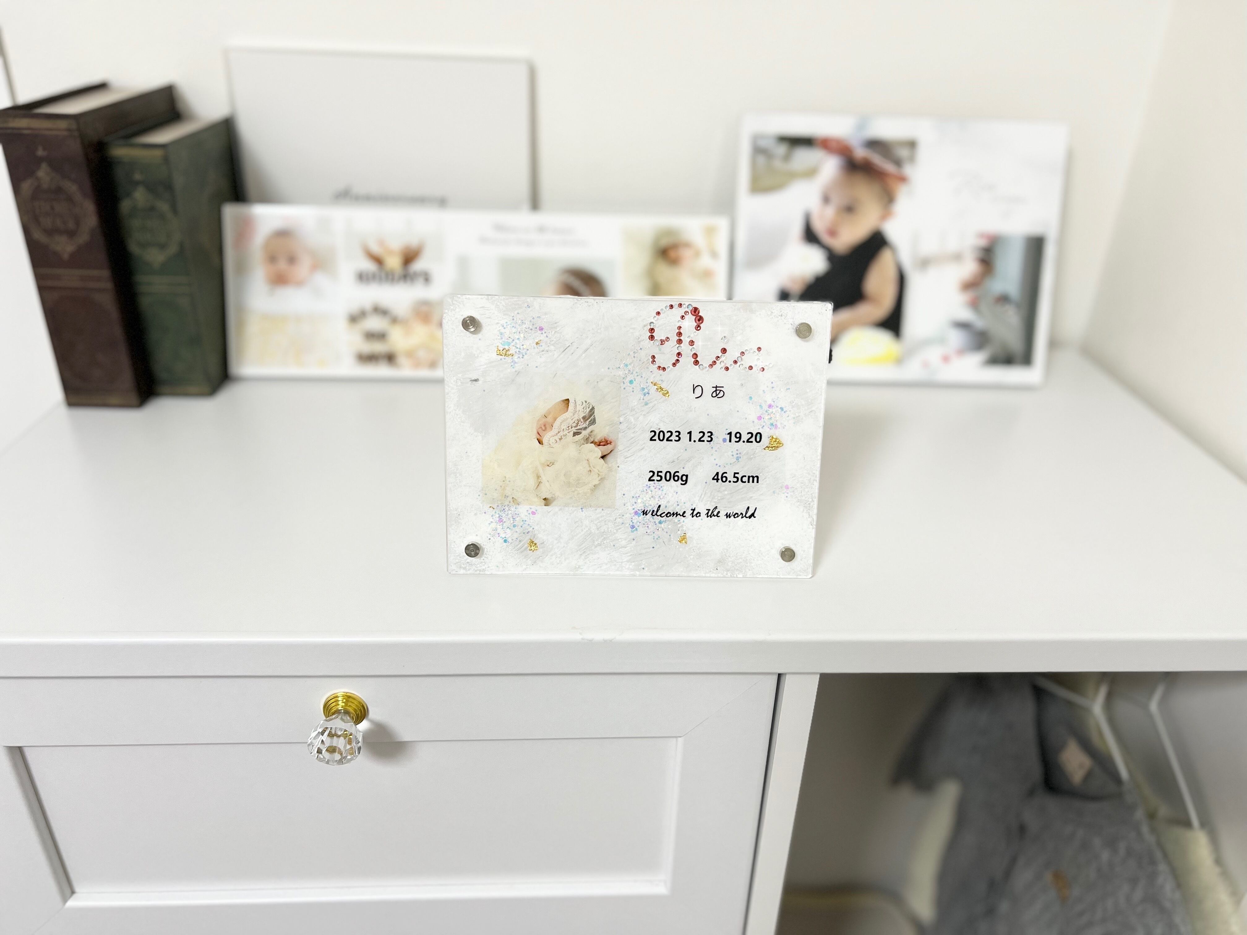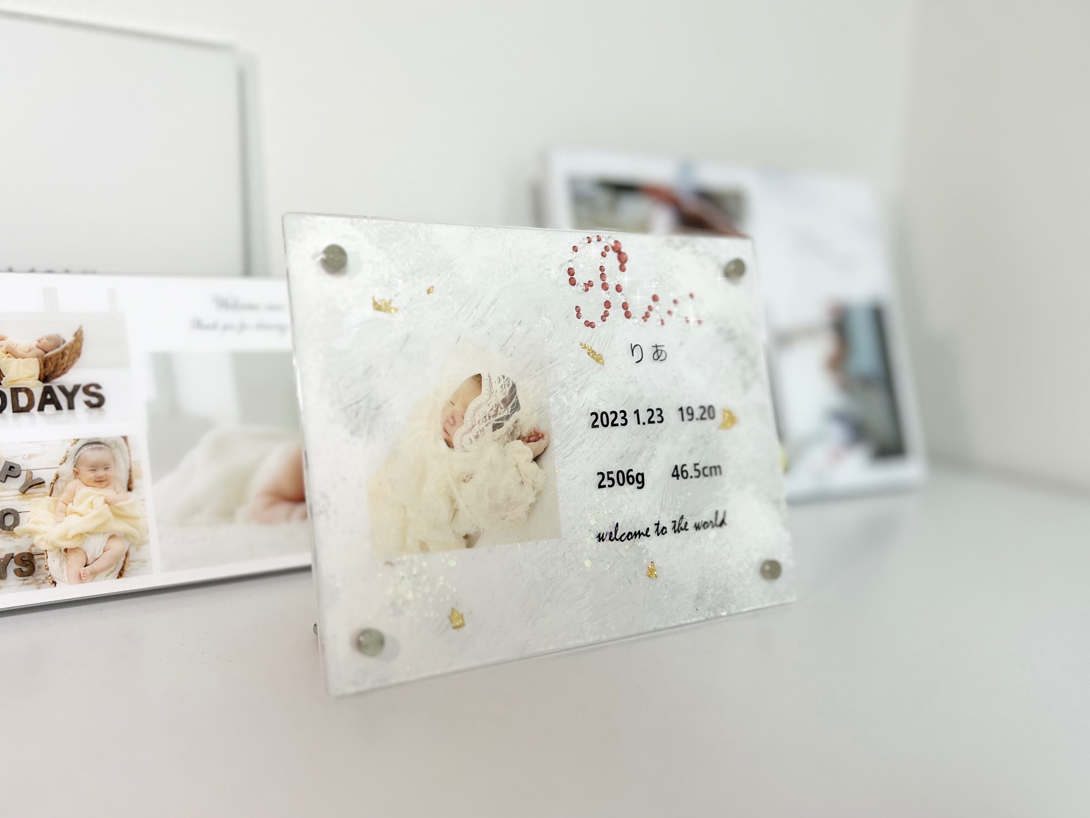 お名前に加え、生年月日・生まれた時間・体重・身長を記録し、世界にひとつだけの「誕生証明」のような一枚に仕上げます。